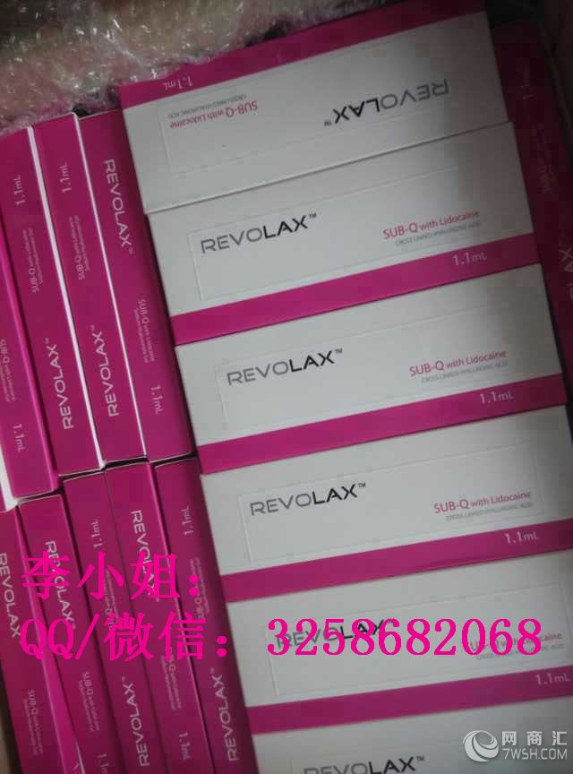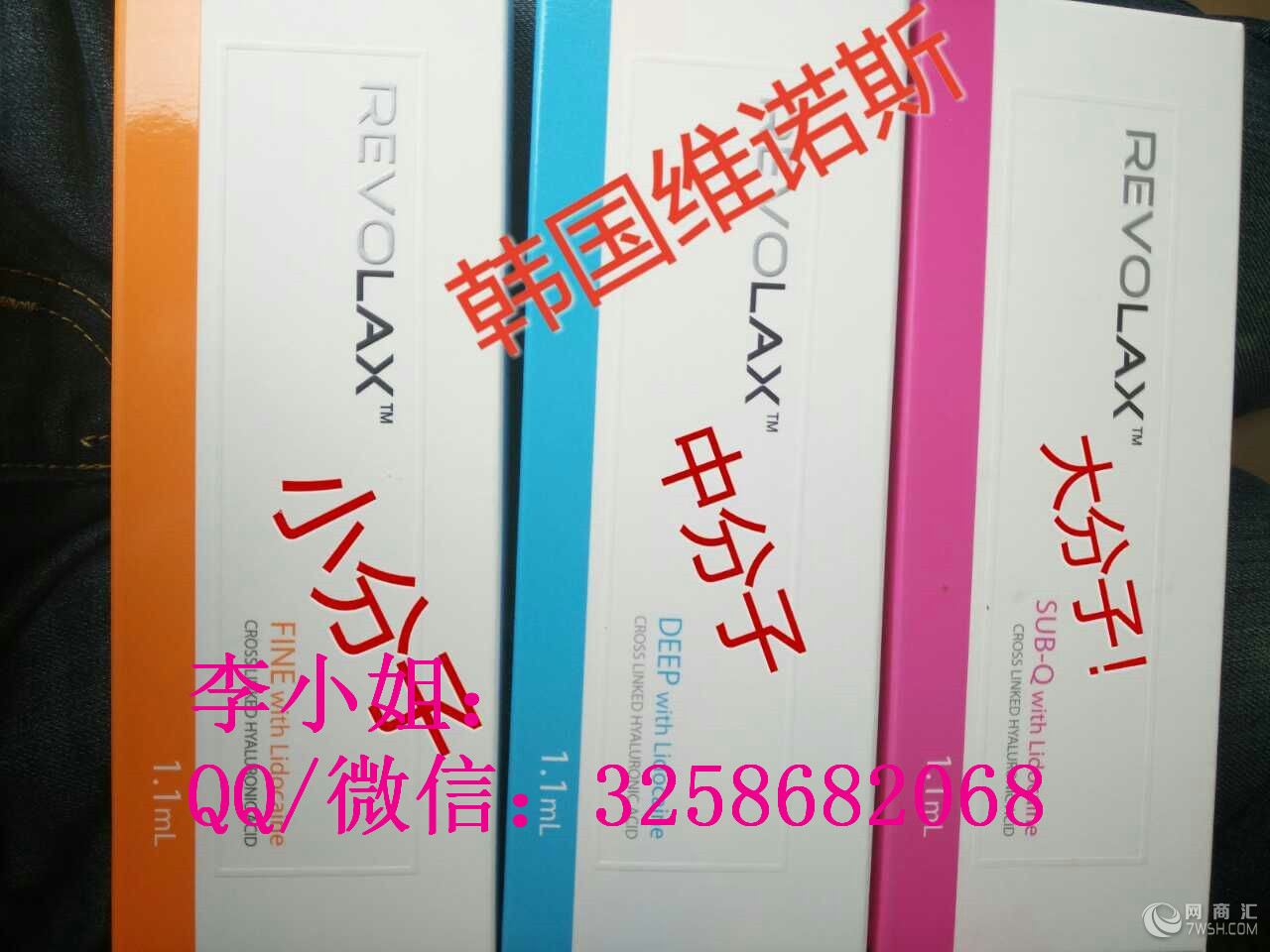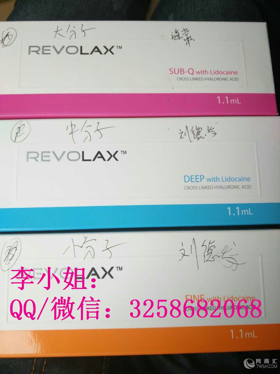 供应各种玻尿酸、美白针、减肥溶脂针、青春素、抗衰老人胎素胎盘素,除皱紧肤产品、原装进口厂家直销物美价廉! 需要了解请联系我们扣扣/微信:3258682068 韩国Revolax维诺斯玻尿酸 Revolax是一款交联型玻尿酸软组织填充剂。通过向面部注射一定量的Revolax产品,达到去除面部皱纹,恢复面部光滑容颜。 使用范围:颈部细纹,法令纹,丰脸颊,丰唇,丰下巴,鼻型塑造 注射深度:真皮的深层,皮下组织中间层 韩国维诺斯玻尿酸。一盒一支,一支1.1ml。玫红色SUBQ(大分子)适用于鼻子,下巴,蓝色DEEP(中分子)适用于苹果肌,法令纹,太阳穴,脸颊,额头及深度皱纹。橙色FINE(小分子)适用于唇部,口周纹,木偶纹,眉心纹,鱼尾纹等。