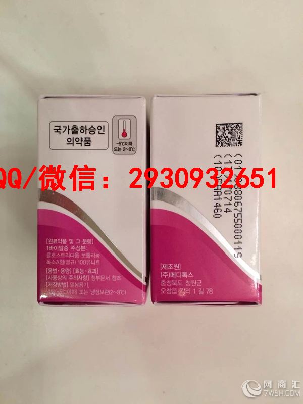 我们本着诚信至上、品牌为重、长期合作,互利共赢的宗旨,以努力的精神、勤奋的态度为广大客户服务! 欲购从速哦。需要了解请联系我们 微信/扣扣:2930932651 [肉毒素的用途] ***除皱*** 脸部的皱纹大部分都是由面部表情肌肉引起的.利用Botulax针剂麻痹减弱形成皱纹的表情肌肉. 将面部皱纹拉平的方法对去除眉间皱纹.额头皱纹.眼尾纹.嘴角皱纹与鼻梁纹有着良好的效果. 施术时间仅需5分钟.简单快捷几乎没有副作用Botulax在特性上6个月内持续效果. 约6个月后需重新注射才能维持效果.这样注射两三次以上.形成皱纹的肌肉弱化后. 就算再形成皱纹也会明显少于以前.持续性的效果得以期待. ***四方脸矫正*** 拥有四方脸的女性给人一种男性化的印象.可以通过简单的Botulax注射. 达到修饰脸型改变印象的效果.形成四方脸的原因分为下颌骨本身发达的情况.咀嚼肌发达的情况. 还有下颌骨和肌肉由于经常咀嚼口香糖.鱿鱼等习惯的人形成咀嚼肌发达的情况.可以通过麻痹肌肉. 不留痕迹.即可得到修饰脸型的效果.广受职场人员欢迎.Botulax的特性可以维持肌肉麻痹6个月左右. 肌肉萎缩矫正四方脸的效果可以持续1年左右. 四方脸自测法将两手掌紧贴左右耳朵下方.咬紧臼齿.鼓起来硬硬的不会就是肌肉(咀嚼肌).