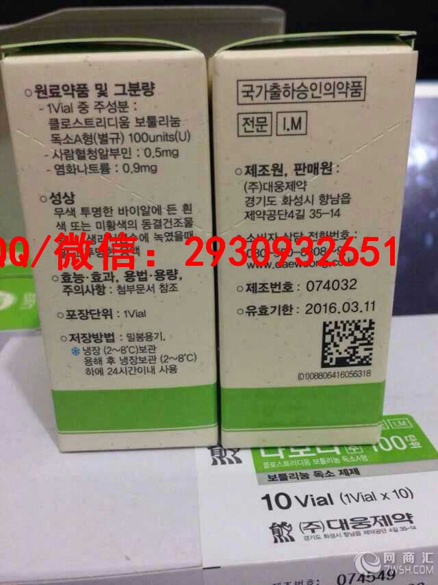 我们本着诚信至上、品牌为重、长期合作,互利共赢的宗旨,以努力的精神、勤奋的态度为广大客户服务! 欲购从速哦。需要了解请联系我们 微信/扣扣:2930932651 [肉毒素的用途] ***除皱*** 脸部的皱纹大部分都是由面部表情肌肉引起的.利用Botulax针剂麻痹减弱形成皱纹的表情肌肉. 将面部皱纹拉平的方法对去除眉间皱纹.额头皱纹.眼尾纹.嘴角皱纹与鼻梁纹有着良好的效果. 施术时间仅需5分钟.简单快捷几乎没有副作用Botulax在特性上6个月内持续效果. 约6个月后需重新注射才能维持效果.这样注射两三次以上.形成皱纹的肌肉弱化后. 就算再形成皱纹也会明显少于以前.持续性的效果得以期待. ***四方脸矫正*** 拥有四方脸的女性给人一种男性化的印象.可以通过简单的Botulax注射. 达到修饰脸型改变印象的效果.形成四方脸的原因分为下颌骨本身发达的情况.咀嚼肌发达的情况. 还有下颌骨和肌肉由于经常咀嚼口香糖.鱿鱼等习惯的人形成咀嚼肌发达的情况.可以通过麻痹肌肉. 不留痕迹.即可得到修饰脸型的效果.广受职场人员欢迎.Botulax的特性可以维持肌肉麻痹6个月左右. 肌肉萎缩矫正四方脸的效果可以持续1年左右. 四方脸自测法将两手掌紧贴左右耳朵下方.咬紧臼齿.鼓起来硬硬的不会就是肌肉(咀嚼肌).