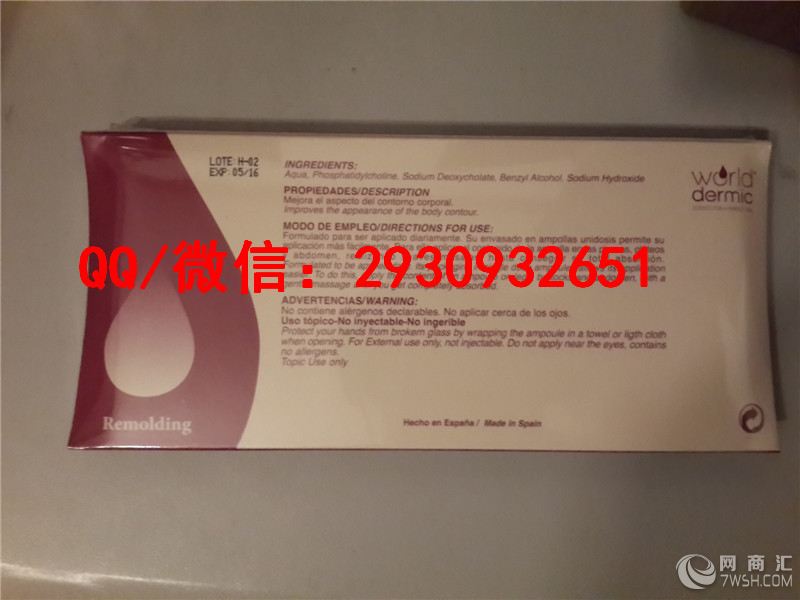 我们本着诚信至上、品牌为重、长期合作,互利共赢的宗旨,以努力的精神、勤奋的态度为广大客户服务! 欲购从速哦。需要了解请联系我们 微信/扣扣:2930932651 西班牙维德斯溶脂针使用方法- 注: 1.注射完维德斯溶脂针以后.要立刻进行深层按摩.将药物均匀的推散开.力度要像经络推拿一样重.客户回家以后.要求以同样的方式.力度.每天按摩至少5-10分钟.否则.无法达到瘦身效果.或者根本没有效果! 2.注射完当天不能冲凉. 3.维德斯溶脂针一般常温下储存即可.不能放入冰箱! 容量:一套两盒.一盒清脂精华.一盒溶脂精华.每盒10支.每支5ml.各样一支为一组. C开头为清脂精华.R开头为溶脂精华. 注射方法: 1.先打C.打在浅层.用25.4的韩国3D长针头.进去三分之一.打完以后再打R.打在脂肪层.用25.4的韩国3D长针头.进去一半或者更深.视客户胖瘦而定.如果是大胖子.脂肪很厚进针就要再深一点.否则达不到脂肪层.C和R要同时注射.但是打在不同的点.例如:C与C之间间隔了3cm.那么就在中间1.5cm的位置注射R. 2.间隔1cm-1.5cm一个点.身体每个点打0.5.面部0.3. 3.面部用1-2组.手臂用2-3组.腰腹部至少用5组.大腿至少用5组.每次多不要超过10组.间隔1-2个月做第二次.连续使用三到4次以上.完全分解掉脂肪细胞不会再反弹. [西班牙维德斯是一款在国内有资质的溶脂针.也是全球为安全有效的溶脂针] 如何能让溶脂针达到佳效果? 进针的深浅非常重要 1.脸.胳膊.小腿脂肪薄的地方用韩国12.7mm的针头.脸部进去一多半.手臂和小腿可以全部进去. 2.大腿.腹部脂肪厚的地方用韩国25.4的长针头.进去一大半.胖的人可以再深一点. 脂脂薄的地方手捏起脂肪45度进针.过深过浅效果都会受影响.