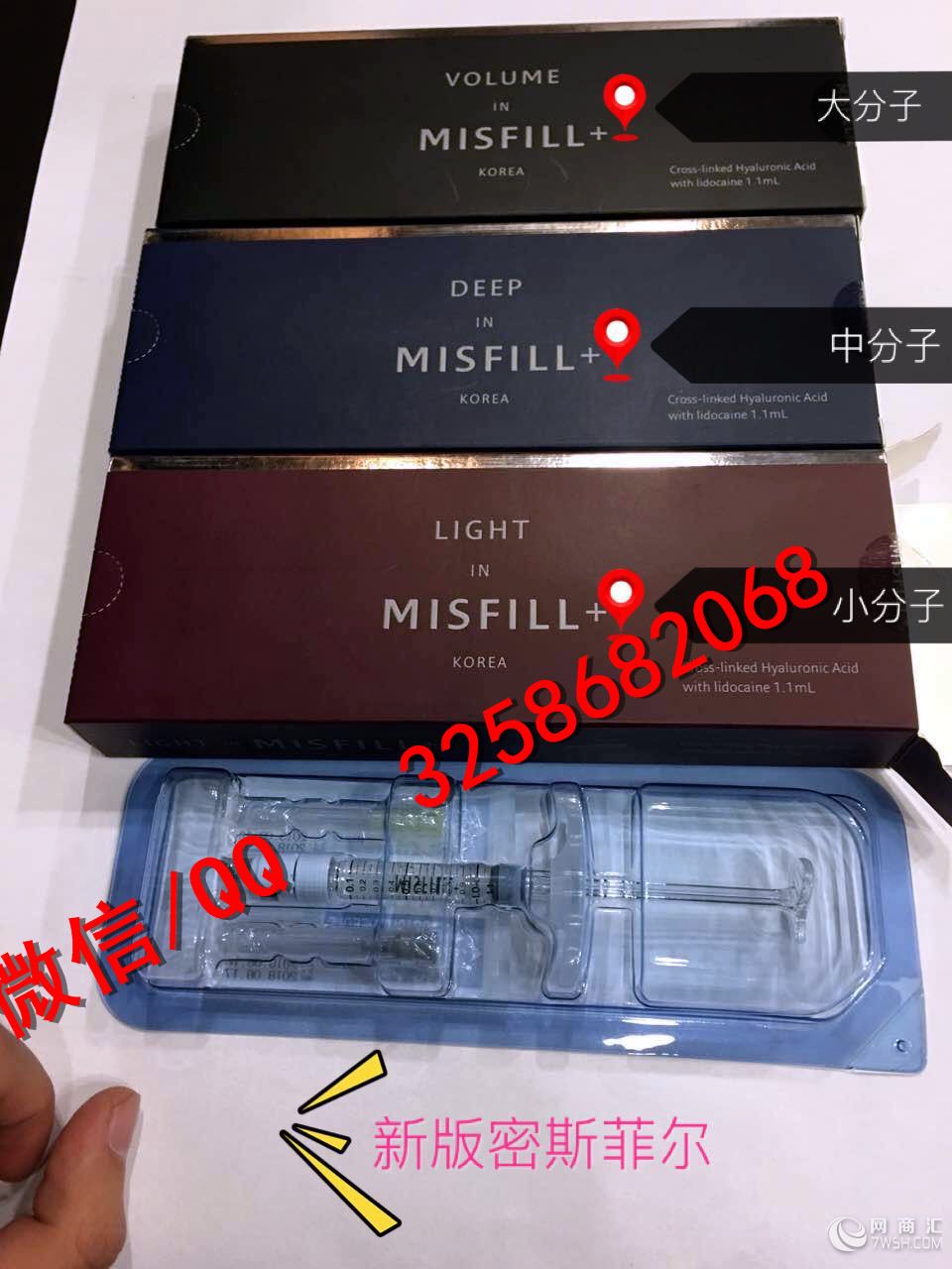 供应各种玻尿酸、美白针、减肥溶脂针、青春素、抗衰老人胎素胎盘素,除皱紧肤产品、原装进口厂家直销物美价廉!需要了解请联系我们扣扣/微信: 3258682068 密斯菲尔是出自于MISKO的制作厂商生产的产品,是采用了能够体现出自然饱满感的特点的产品。适合与MISKO手术一并使用,同时也是一种填充术后不足部位的玻尿酸。 密斯菲尔 特别优点: - 高纯度的安全玻尿酸 MIS FILL - 长时间维持自然的美丽状态。 玫瑰色小分子:适用于唇部,口周纹,木偶纹,眉心纹,鱼尾纹等 蓝色中分子:适用于苹果肌,面颊,法令纹,抬头纹,深度皱纹,太阳穴面部软组织填充 黑色大分子:适用于?鼻子,下巴。效果跟乔雅登媲美喔