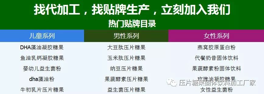 3主要经营:OEM贴牌代加工,产品类型有:粉剂 固体饮料,压片糖果,片剂 凝胶糖果,软胶囊 代餐粉,保健品咀嚼片 口服饮液等等产品。