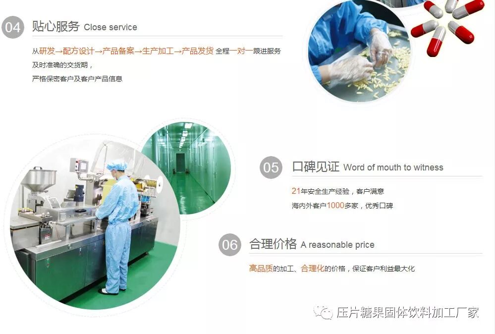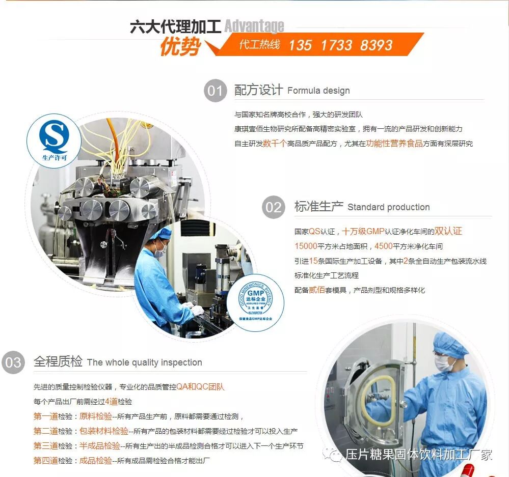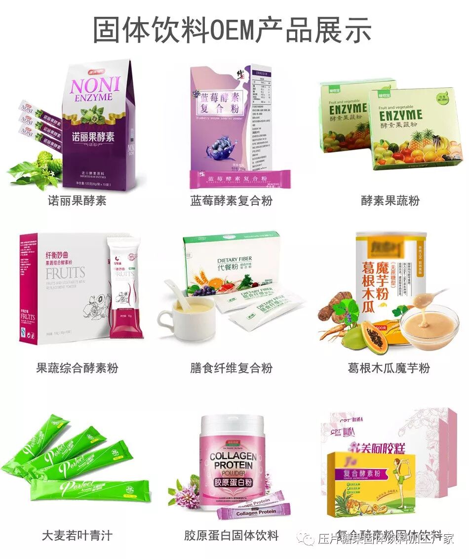 OEM/ODM一站式服务TEL:18808972922 张丽(同微信号) 综合果蔬植物酵素固体饮料代加工贴牌/葛根木瓜粉贴牌湖南厂家 湖南康琪壹佰生物科技有限公司成立于2003年 是中南地区大型代加工厂家,是多元化控股企业集团,是湖南省一家专业的食品/营养保健品生产企业 10万级结净车间,,通过GMP体系认证和进出口功能食品认证研发、生产型企业!十多年生产经验,200多个品种规格 500多个配方(持续上升)300吨片剂年产量 公司拥有自己的营养研究所和科研人员,专门从事营养健康食品的研发、生产,形成了自己的行科技研发优势;是湖南省一家综合科研、生产、销售、连锁专卖和售后服务一体并的高新技术企业。 公司具备软胶囊(凝胶糖果)、片剂、颗粒剂、粉剂、茶剂、固体饮料,口服饮品生产能力,公司现有80多个品规畅销各大连锁终端。 康琪壹佰生物科技有限公司,专业OEM贴牌代加工,长期为您代工各类大健康食品:酵素粉、胶原蛋白固体饮料、固体饮料、魔芋代餐粉、青汁粉、五谷代餐粉、压片糖果等。 加工合作方式; 工厂连线 公司名称:湖南康琪壹佰生物科技有限公司 业务经理:TEL:18808972922 张丽 经理(同weixin号) 公司网站:https://shop222895044z0c3.1688.com 工厂地址:湖南株洲市天元区长江南路8号