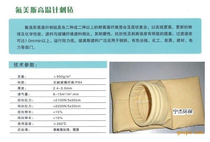 氟美斯高温除尘布袋 氟美斯高温除尘布袋是除尘器的核心配件。该布袋尺寸的设计、布袋裁剪和布袋的加工制作都有严格的要求。我公司生产的氟美斯除尘滤袋质量优良、货源充足,顾客可以大量的订购。 产地:河北省>泊头市 供应商:河北宁杰环保科技有限公司 氟美斯高温除尘布袋特性: 耐高温氟美斯针刺毡除尘布袋是在玻纤针刺毡的基础上添加P84纤维,使毡层更加紧密,纤维之间的环绕增强,可以应对更高的过滤风速。P84纤维呈三叶型截面,然后构成很高的外表积系数,增大了捕尘机率,而且该纤维分外的截面形状,使粉尘大多数被会集到滤料外表,较难渗透到滤料内部阻塞空位,下降作业阻力然后行进了过滤风速。氟美斯布袋是高效的耐高温、耐腐蚀、耐酸碱、耐折耐磨复合型商品。氟美斯是为高炉煤气干法除尘研制成功的一种新式高温滤料。 选氟美斯高温除尘布袋_选_除尘布袋生产厂家,产品_,耐腐蚀,耐酸碱,使用寿命长,粉尘剥离,除尘效果好,过滤效果佳,实用效果好,值得信赖!作为_的氟美斯高温除尘布袋生产厂家,还经营销售的产品有:pps ptfe除尘滤袋、pps针刺毡滤袋、抗氧化ptfe除尘布袋、高硅氧覆膜滤袋、美塔斯针刺毡滤袋、锅炉除尘器滤袋、单机布袋除尘器、脉冲环保除尘布袋、袋式除尘器滤袋、环保设备除尘布袋、除尘器专用滤袋等。质量_,型号齐全,提供_的售前、售中、售后服务,欢迎选购洽谈!技术参数: