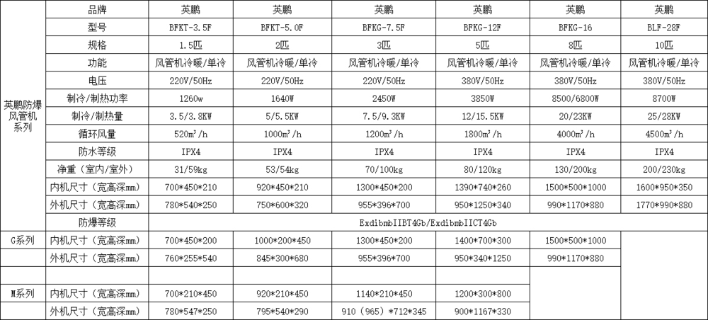 品牌:英鹏 型号:BF KT-5.0F 规格:2匹 功能:冷暖/单冷 电压:220V/50Hz 制冷/制热功率:1640W 制冷/制热量:5/5.5KW 循环风量:1000m3/h 防水等级:IPX4 净重(室内/室外):53/54kg 噪音:62dB(A) 内机尺寸(宽高深mm):920*450*210 外机尺寸(宽高深mm):750*600*320 防爆等级:ExdibmblIBT4Gb/ExdibmbIlCT4Gb 二、附加功能 英鹏防爆空调可根据客户的要求定制附加以下几类功能。 1. 断电记忆、来电自启。 2. 远程控制。 3. 防腐性功能。 4. 防爆等级:ExdibmbIICT4Gb 5.粉尘防爆:粉尘防爆:ExtDibDmbA21IP65T130℃ 产品介绍: 广州英鹏防爆空调系列机型通过特殊防爆技术加工处理,广泛应用于科研、石油、化工、制药、加工制造、生物等存在ⅡA、ⅡB级,T1~T4组可燃性气体、蒸汽与空气混合形成的易引发爆炸的危险场所,是针对有温度控制要求场所设计的特种调温空调设备,系列产品均通过防爆电气产品质量监督检测中心检验,获得防爆电气设备防爆合格证:防爆空调机CNEX12.1495/1496;其外形美观,设计合理并具有安装维修方便等特点,全系列防爆产品内部采用压缩机、微电脑控制、数字显示,具有噪声低、性能稳定、操作简便等优点。深受广大特需行业客户喜爱,并以部分录入特需行业定点采购名录。 本系列产品执行标准如下: 防爆空调产品的特点: 1、采用国际滚动转子式压缩机,低噪音防爆风机,运行平稳可靠、省电,使用寿命长。 2、采用高效多折式散热器,冷媒通过与空气的接触更充分,能大幅度的提高空调的制冷制热效果。 3、功能齐全,自动判断和自动运行,制冷,制热,除湿,送风任意选择,可进行四方位风向调节。 4、外表美观、操作方便、节省空间、易于安装。 5、电源为220V/50Hz、115V/60Hz、220V/60Hz多种。 6、防爆结构设计,安装方便,安全可靠,质量更加有保障。 7、防爆标志:Exdmib Ⅱ BT4。 8、适用于科研、石油、化工、制药、工厂、仓储等易燃易爆场所。 适用范围: 1.本产品适用于石油化工、冶金、纺织、食品、生物工程、制药、仓库、航天航空工程及军工等爆炸性环境中,有温度控制要求的场所; 2.1区、2区危险气体场所 3.IIA、IIB、IIC类T1-T4组爆炸性气体或蒸汽环境; 4.环境温度:-5℃~ 43℃。