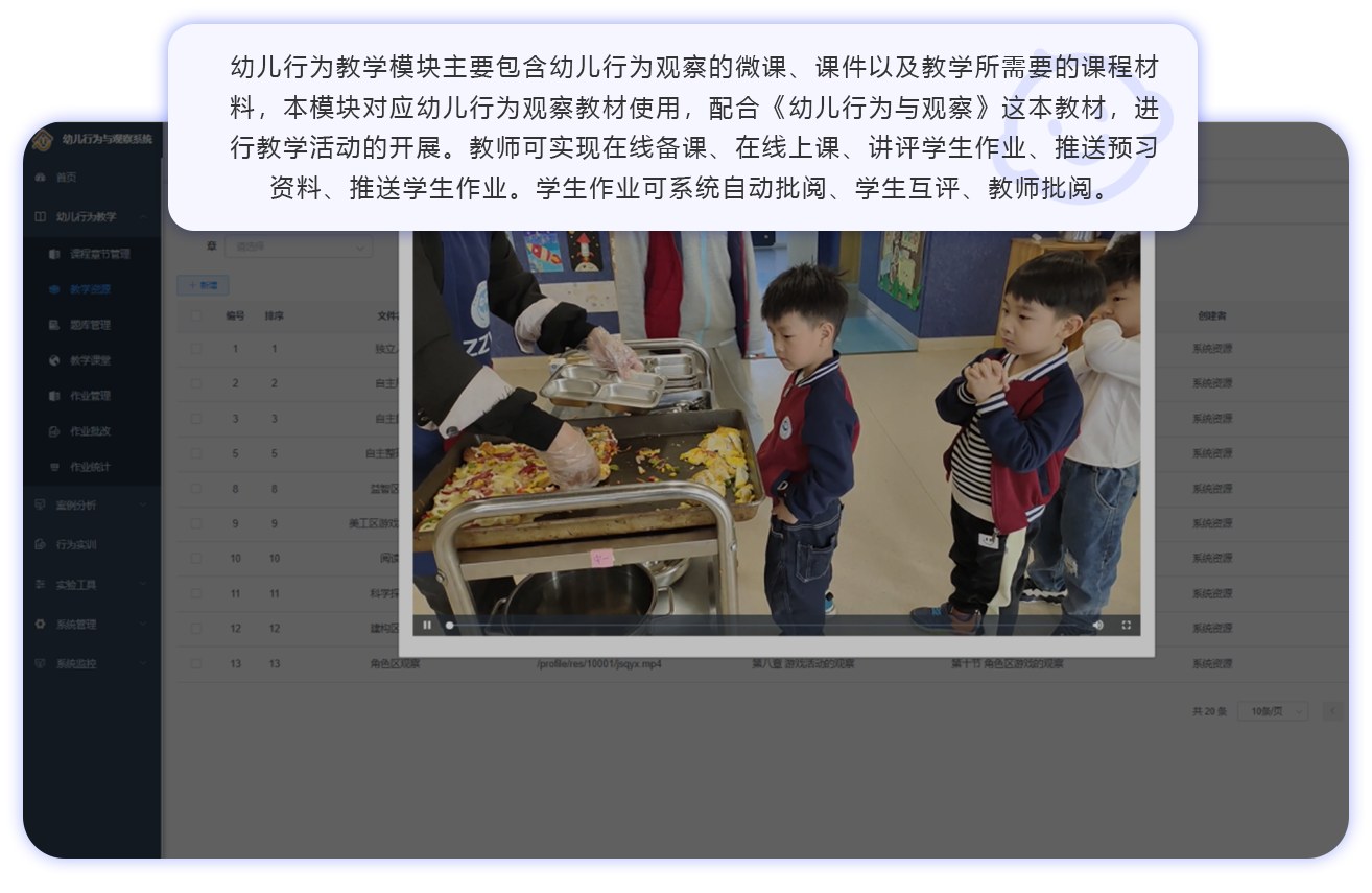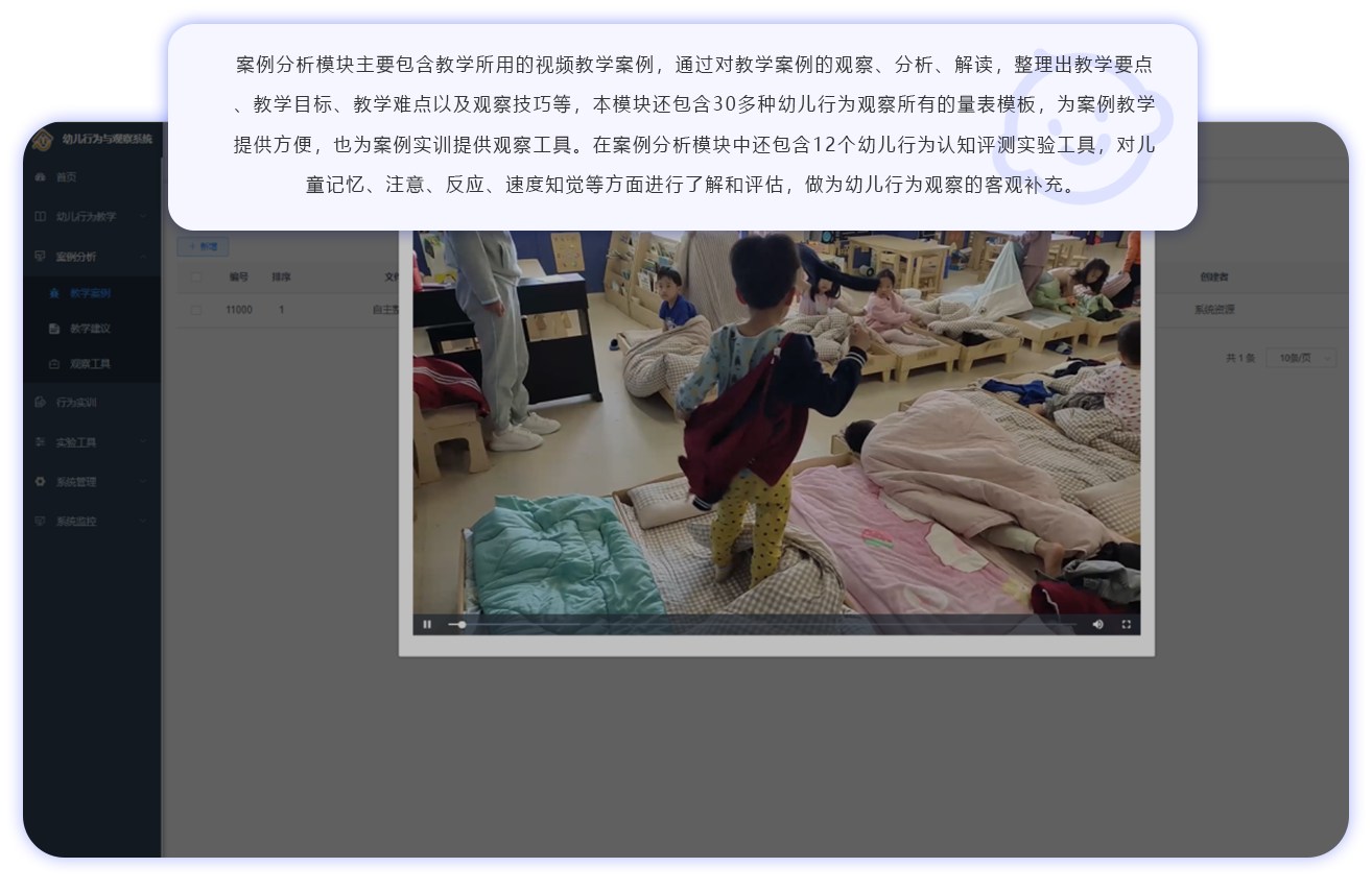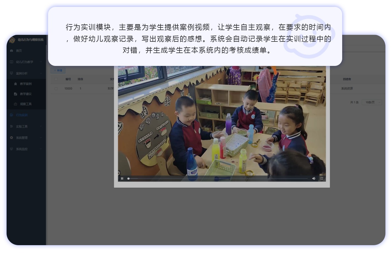 幼儿行为观察教学与分析实训系统分为三个核心模块:幼儿行为教学模块、案例分析模块、行为实训模块,通过这三个模块,实现教师可以顺利的讲一堂专业的幼儿行为观察课程,同时学生也可以训练掌握幼儿行为观察的技能与技巧,培养实用型人才。
